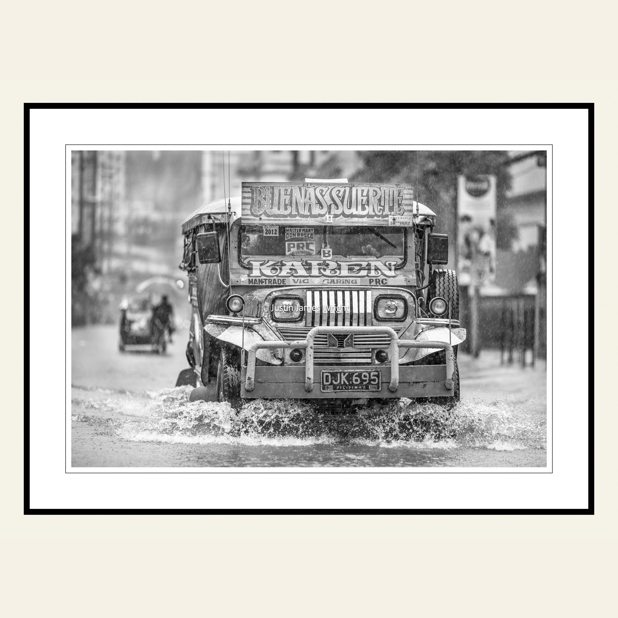 A jeepney speeds through a flooded street during a storm. Jeepneys are an affordable and popular mode of public transport throughout the Philippines.